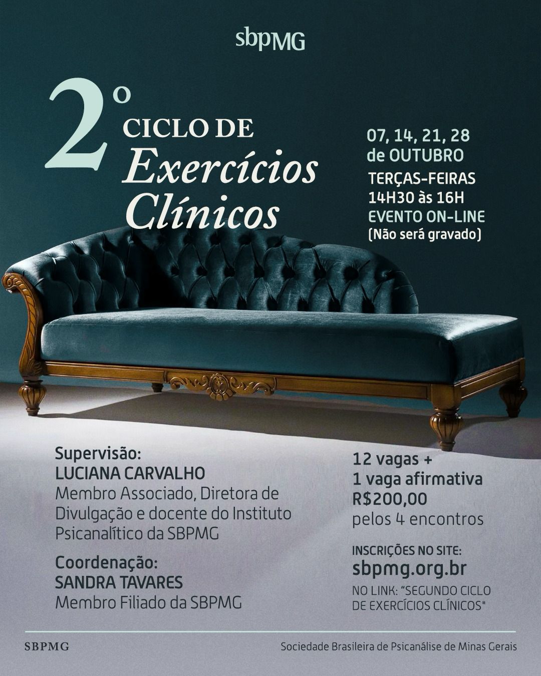 COMO SE INSCREVER — Fique atento às postagens da Sociedade Brasileira de Psicanálise de Minas Gerais no Instagram e Facebook para acompanhar as novidades e o período de inscrições dos eventos.
